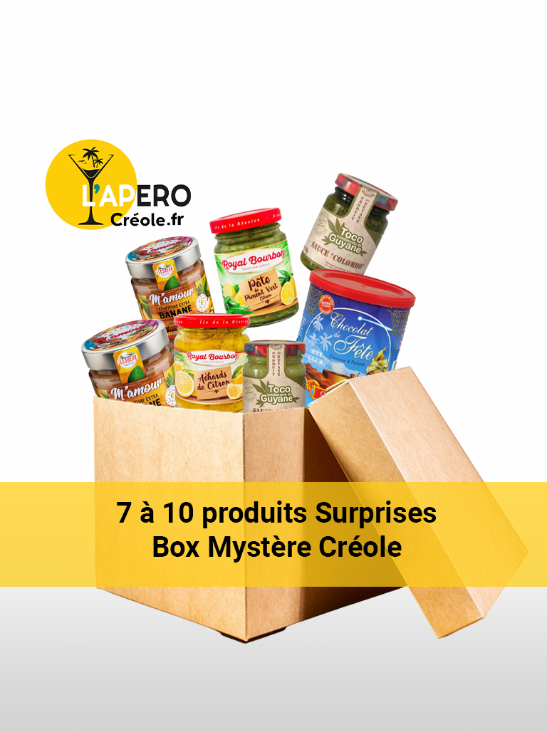 La Box Créole Mystère d’Apéro Créole est une box antigaspi remplie de produits 100 % créoles, soigneusement choisis parmi nos meilleures références à date courte.